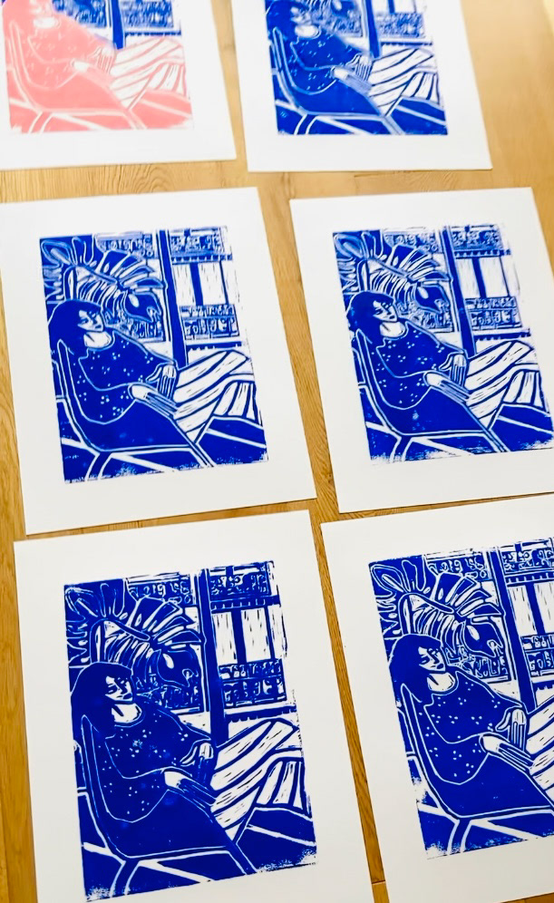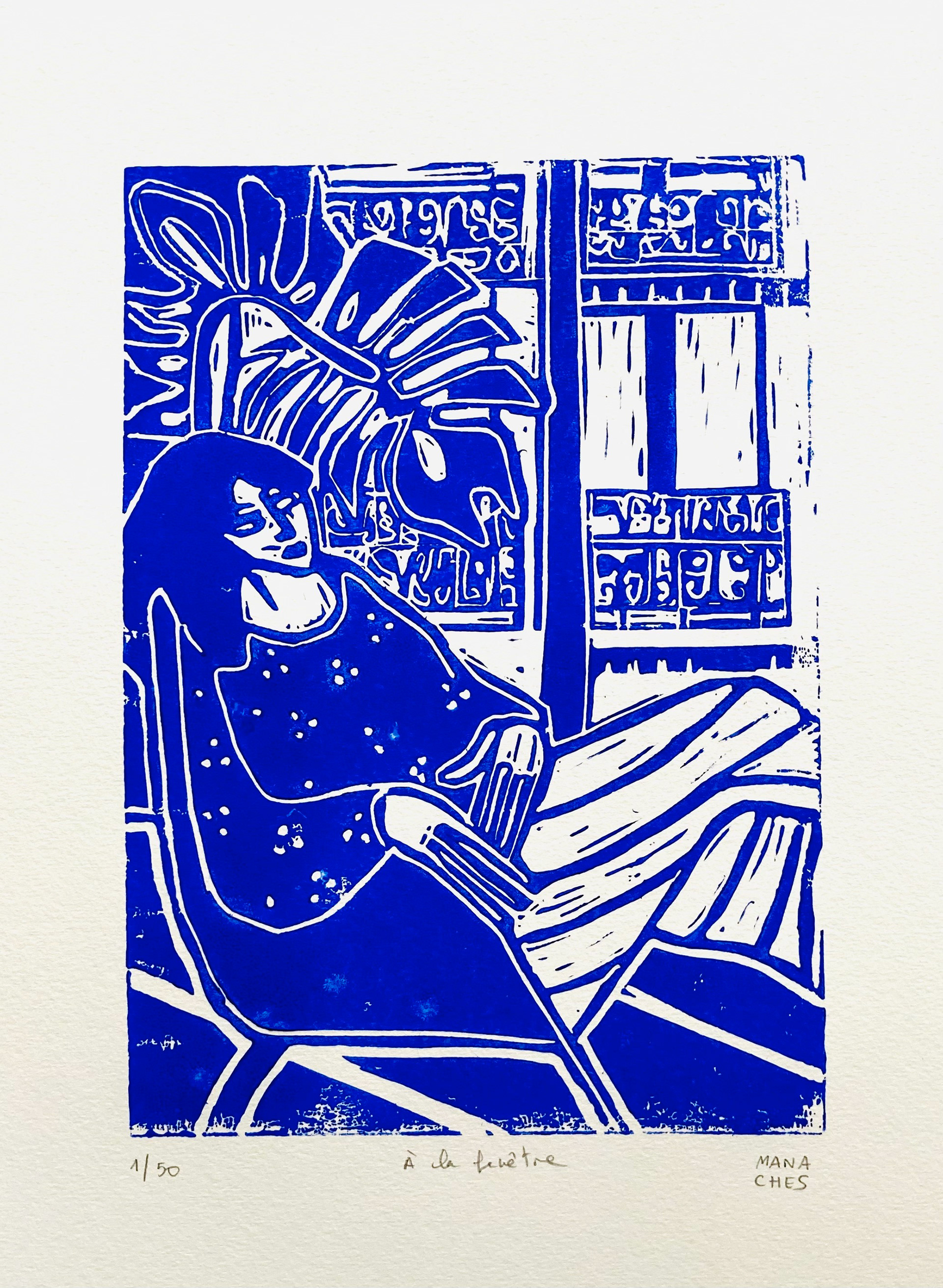 Linogravure sur papier artistique 250 g/m². Format 30 x 42 cm. Série unique encrée à la main, numérotée et signée. Version monochrome bleue